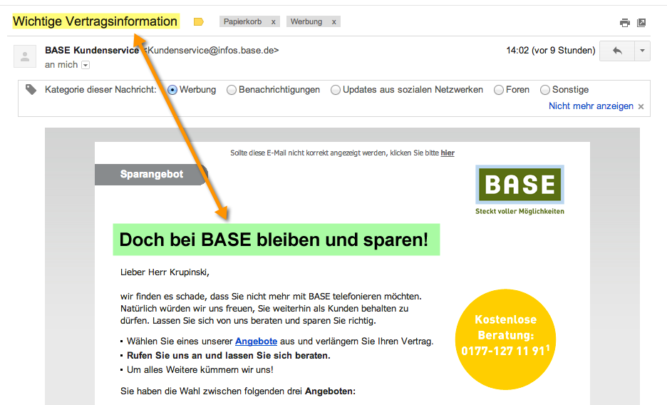 Doch BASE will mich nicht so einfach ziehen lassen: Inzwischen bekomme ich E-Mails mit dem Betreff ‚Wichtige Vertragsinformation‘. Sowas öffnet man für gewöhnlich, weil man vermutet, dass möglicherweise ein Eingreifen notwendig werden könnte. Doch diese wichtige Vertragsinformation entpuppt sich umgehend als weiterer Werbeversuch, um mich zum Bleiben zu bewegen.